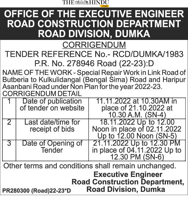Special Repair Work in Link Road of Butberia to Kulkulidangal (Bengal Sima) Road and Haripur Asanbani Road under Non Plan for the year 2022-2