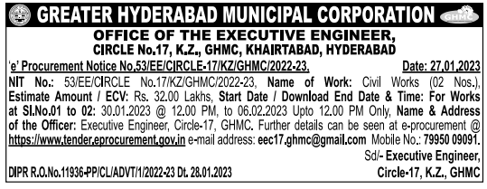Tender for Civil Works (02 Nos.),in GREATER HYDERABAD MUNICIPAL CORPORATION