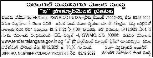 RO. No. 9768-PP/CL/ADVT/1/2022-23, Dated: 05.12.2022 Warangal Metropolitan Corporation