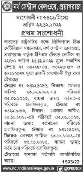 An amendment has been issued by the Principal Chief Material Manager, North Central Railway, Prayagraj on behalf of the President of India vide EPS