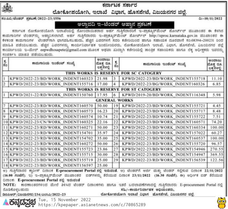 more details contact the Executive Engineer, Public Works Department, Division, Hospete, Vijayanagar District