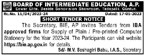 AP invites Tenders from IBA approved firms for Supply of Plain Pre-printed Computer Stationery for the Year 2023-24.