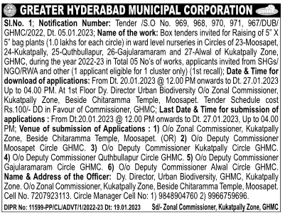 Box tenders invited for Raising of 5 X 5 bag plants (1.0 lakhs for each circle) in ward level nurseries in Circles of 23-Moosapet, 24-Kukatpally, 25-Quthbullapur, 26-Gajularamaram and 27-Alwal of Kukatpally Zone, GHMC, during the year 2022-23 in Total 05 No’s of works,