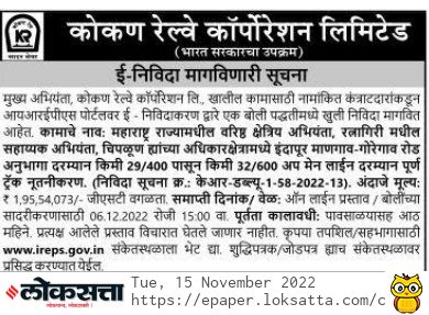 Chief Engineer, Konkan Railway Corporation Ltd. Open tenders are invited from