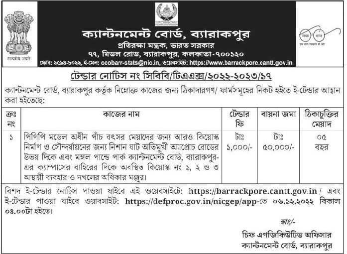 Detailed e-tender notice will be available on the website: https://barrackpore.cantt.gov.in/