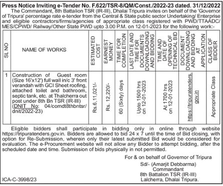 Construction of Guest room (Size 16’x12′) full wall in/c 3 front verandah with GCI Sheet roofing, attached toilet and bathroom, septic tank, etc. at Thalcherra out post under 8th Bn TSR (IR-III) (DNIT No: 04/comdt8thbntsr/ dnit/2022-23)