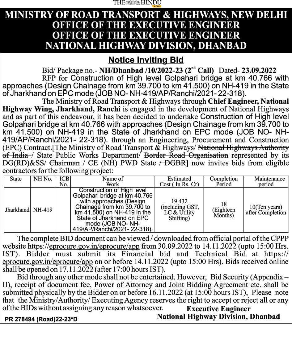 Construction of High level Golpahari bridge at km 40.766 with approaches (Design Chainage from km 39.700 to km 41.500) on NH-419 in the State of Jharkhand on EPC mode (JOB NO- NH 419/AP/Ranchi/2021-22-318).