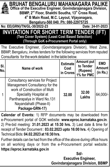 Consultancy services for Project Management Consultancy for the work of Construction of Multi Speciality Hospital