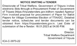 Directorate of Tribal Welfare, Government of Tripura invites electronic Bids through e-Procurement Portal of Government of Tripura (https://tripuratenders.gov.in)from reputed Agency/ Firm involved proposal for procurement of Paper for Ballot