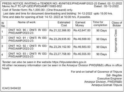 PRESS NOTICE INVITING e-TENDER NO: 45/NIT/EE/PWD/AMP/2022-23 Dated: 02-12-2022