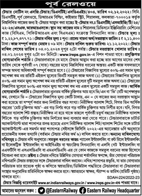 The tender notification is also available on the website www.er.indianrailways.gov.in/www.ireps.gov.in.