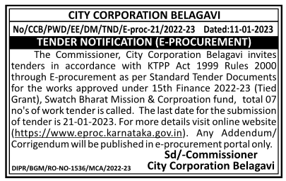 City Corporation Belagavi invites tenders in accordance with KTPP Act 1999 Rules 2000 through E-procurement as per Standard Tender Documents for the works approved under 15th Finance 2022-23 (Tied Grant), Swatch Bharat Mission & Corproation fund, total 07 no’s of work tender is called.