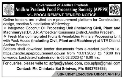 e-procurement platform for Construction, design, erection & installation of following: Integrated Coconut Oil Processing Unit (Including Civil, Plant and Machinery) at Dr. B.R.Ambedkar Konasema District, Andha Pradesh. Fresh Mango Integrated Fruits & Vegetables Primary Processing Unit with Pack House (Including Civil, Plant and Machinery) at NTR District Andhra Pradesh.