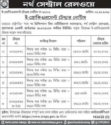 North Central Railway, Prayagraj (an ISO 9001:2015 certified unit) on behalf