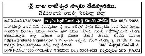 E-procurement tenders are invited for various arrangements, engineering department works and other works at Sri Raja Rajeswara Swamy Devasthanam on the occasion of Mahashivaratri Jatara, 2023.