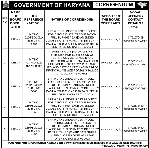 E-TENDER FOR SUBMISSION OF TECHNO COMMERCIAL BID AND PRICE BID ON WEB PORTAL HAS BEEN EXTENDED UPTO 20.02.2023 AT 15.00 HRS. AND DATE OF OPENING PART-I OF PROPOSAL ON WEB PORTAL SHALL