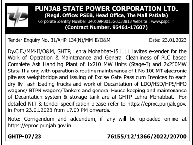e-tender for the Work of Operation & Maintenance and General Cleanliness of PLC based Complete Ash Handling Plant of 1×210 MW Units (Stage-I) and 2x250MW State-II along with operation & routine maintenance of 1 No 100 MT electronic piteless weightbridge and issuing of Excise Gate Pass cum Invoices to each dry fly ash loading trucks and work