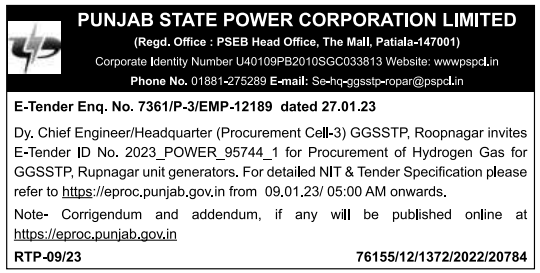 E-Tender ID No. 2023_POWER_95744_1 for Procurement of Hydrogen Gas for GGSSTP, Rupnagar unit generators.