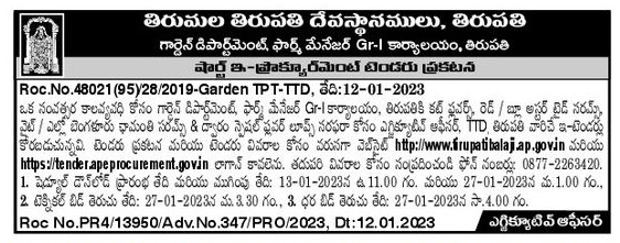 E-Tenders are invited by Executive Officer, TTD, Tirupati for supply of Cut Flowers, Red / Blue Aster Tide Narams, White / Yellow Bangalore Chamanti Sarams & Dwaram Special Flower Loops