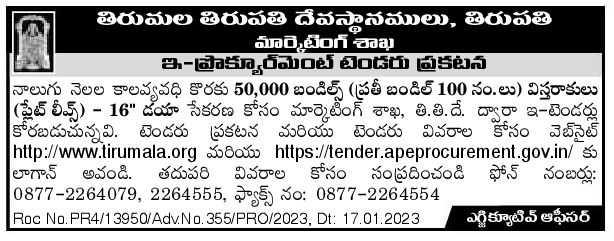 E-Tenders are invited by Marketing Department, TITDE for procurement of 50,000 bundles (100 pcs per bundle) of Vistaraku (Plate Leaves) – 16 dia for a period of four months.