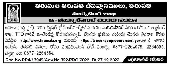 E-tenders are invited by Marketing Department, TTD for procurement of Mustard (Pedda Nij), Chilli Special Grade Agmark and Agave Powder.