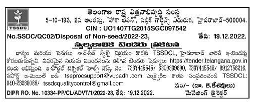 E-tenders are invited by TSSDCL, Hyderabad for sale of grain and non-seed stocks.