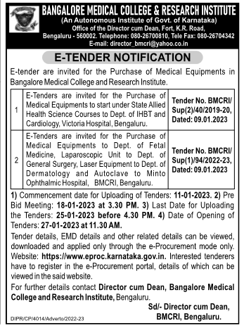 E-Tenders are invited for the Purchase of Medical Equipments to start under State Allied Health Science Courses to Dept. of IHBT and Cardiology, Victoria Hospital, Bengaluru.