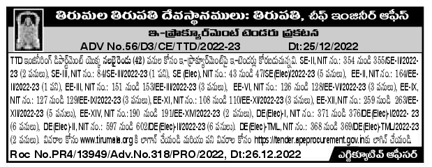 E-tenders are invited on e-procurement for forty two (42) works of TTD Engineering Department