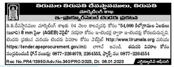 E-tenders are invited through e-tenders for the supply of 54,000 Kg Cardamoms (Ilachi) 8 mm Size (AGEB) Variety for a period of 04 months to the Marketing Department of TIT Devasthanams