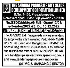 e-tenders for supply of freshly harvested Paddy RNR 15048 C/S or T/L Seed and Bengalgram PKVK-2 TIL Seed during Rabi 2022-23 season.
