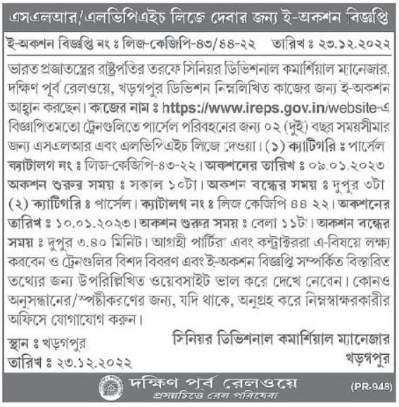 ease of SNLR and LVPH for a period of 02 (two) years for transportation of parcels in trains as advertised. (1) Category : Parcel Catalog No. : Lease-KGP-43-22.