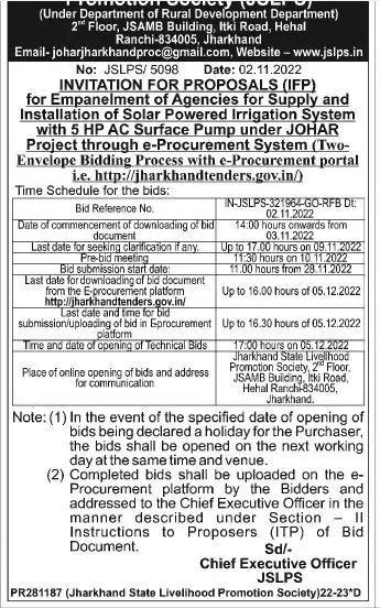 Empanelment of Agencies for Supply and Installation of Solar Powered Irrigation System with 5 HP AC Surface Pump under JOHAR Project through e-Procurement System (Two Envelope Bidding Process with e-Procurement portal i.e. http://jharkhandtenders.gov.in/)