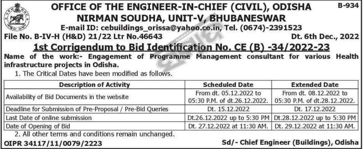 1st Amendment to Bid Identification No. CE (B) -34/2022-23