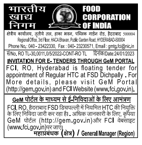 FCI, RO, Hyderabad is floating tender for appointment of Regular HTC at FSD Dichpally.