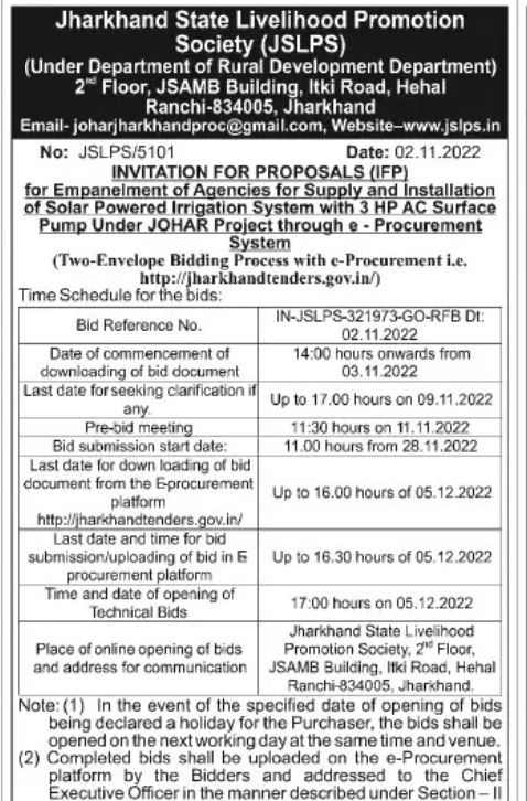 for Empanelment of Agencies for Supply and Installation of Solar Powered Irrigation System with 3 HP AC Surface Pump Under JOHAR Project through e-Procurement System