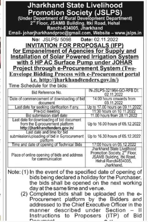 for Empanelment of Agencies for Supply and Installation of Solar Powered Irrigation System with 5 HP AC Surface Pump under JOHAR Project through e-Procurement System (Two Envelope Bidding Process with e-Procurement portal