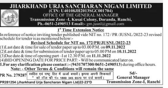 In reference of notice inviting tender published vide NIT no. 172/PR/JUSNL/2022-23 revised