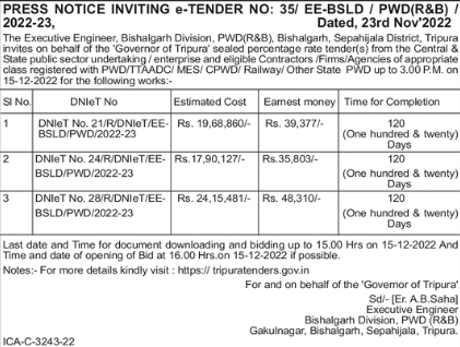 PRESS NOTICE INVITING e-TENDER NO: 35/ EE-BSLD / PWD(R&B)