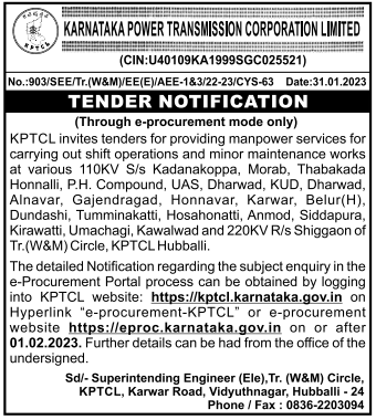 KPTCL invites tenders for providing manpower services for carrying out shift operations and minor maintenance works at various 110KV S/s Kadanakoppa, Morab, Thabakada Honnalli, P.H. Compound, UAS, Dharwad, KUD, Dharwad, Alnavar, Gajendragad, Honnavar, Karwar, Belur(H), Dundashi, Tumminakatti, Hosahonatti, Anmod, Siddapura, Kirawatti, Umachagi, Kawalwad and 220KV R/S Shiggaon of Tr.(W&M) Circle, KPTCL Hubballi.
