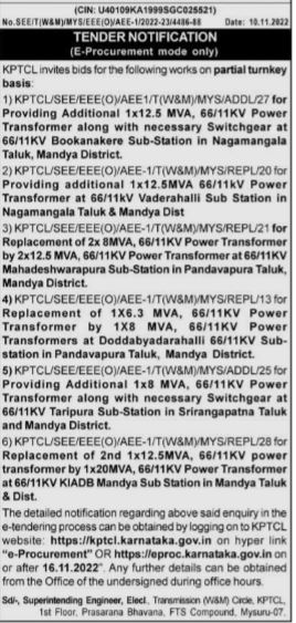 KPTCL invites bids for the following works on partial turnkey