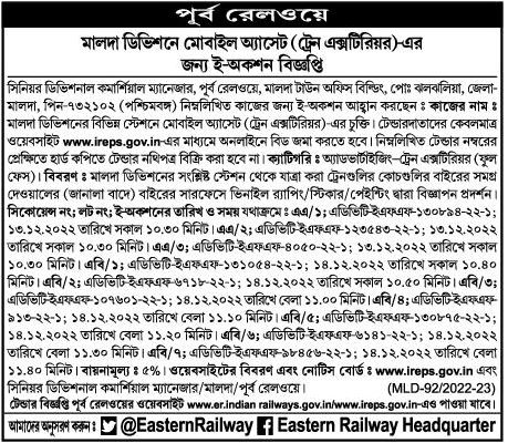Tender Notification is also available on Eastern Railway website www.er.indian railways.gov.in/www.ireps.gov.in.