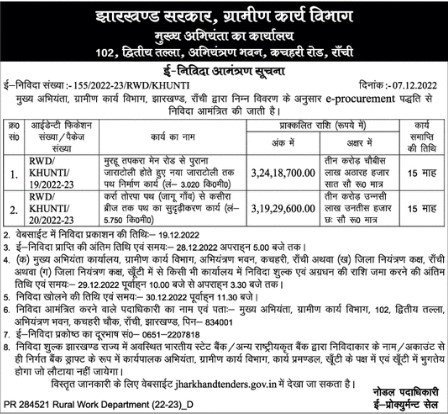 is invited by Chief Engineer, Rural Works Department, Jharkhand, Ranchi through e-procurement method as