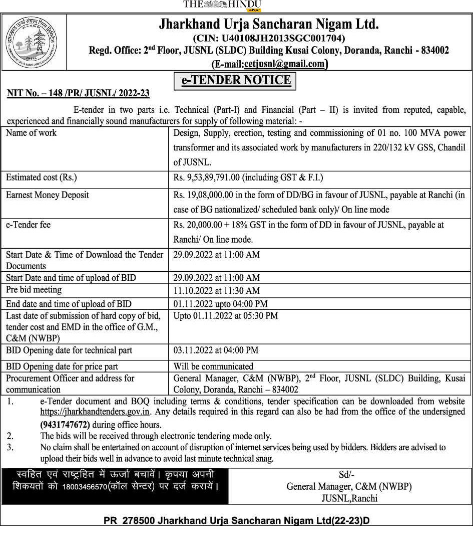 Design, Supply, erection, testing and commissioning of 01 no. 100 MVA power transformer and its associated work by manufacturers in 220/132 kV GSS, Chandil of JUSNL.