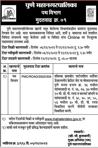 Extension of time for the works of the below mentioned departments of Pune Municipal Corporation is being given. Tender terms,conditions etc. regarding the said work. All the details are mentioned in the tender package and the tender package is available