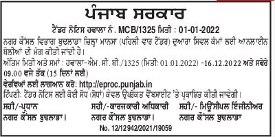 Online bids are invited for civil works by Municipal Council Department Budhlada District