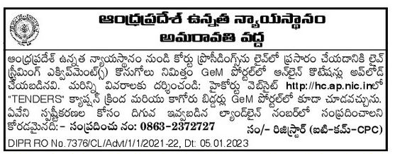Online quotations are uploaded on GeM portals for purchase of live steaming equipments) for live streaming of court proceedings from Andhra Pradesh High Court.