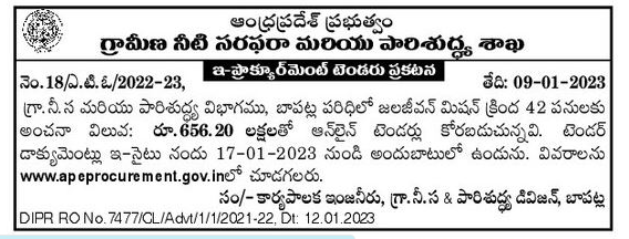 Online tenders are invited for 42 works under Jaljeevan Mission under G.N.S. and Sanitation Department, Bapatla