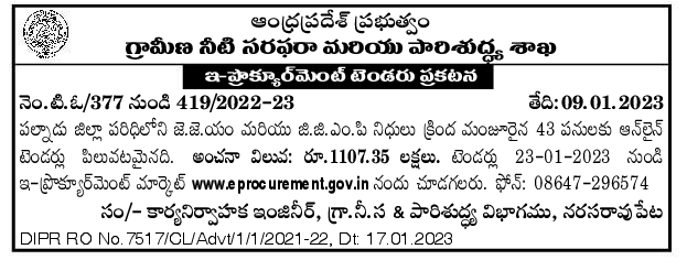 Online tenders are invited for 43 works sanctioned under JJYM and GGMP funds under Palnadu district.
