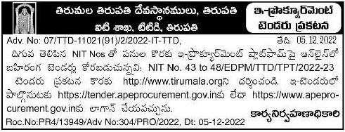with below mentioned NIT Nos. NIT No. 43 to 48/EDPM/TTD/TPT/2022-23