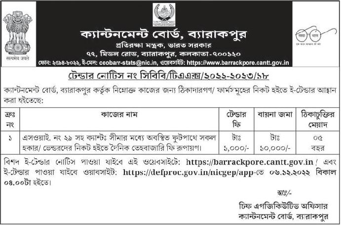 Detailed e-tender notice will be available on website: https://barrackpore.cantt.gov.in/ and